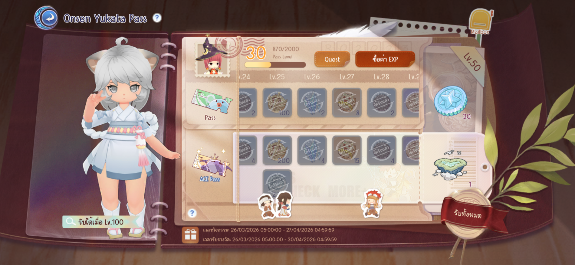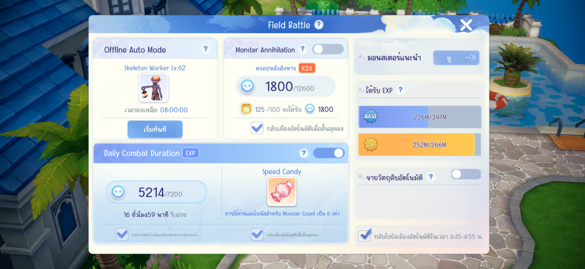 Daily Combat Duration ซึ่งจะเป็นการฟาร์ม EXP และไอเทม โดยสามารถใช้ ลูกอม (Speedy Candy) ในการลดระยะเวลาได้