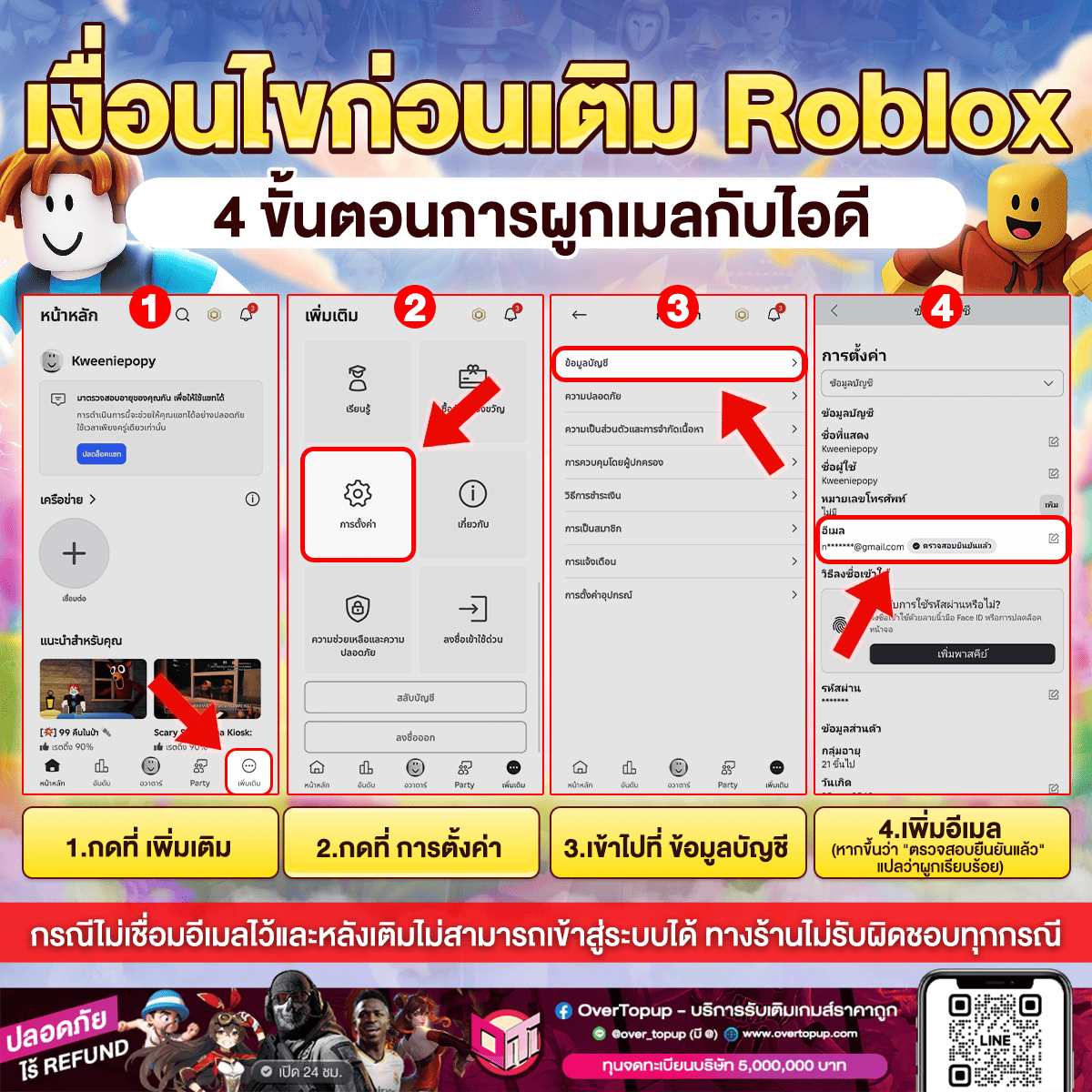 โปรดอ่านเงื่อนไขก่อนสั่งซื้อสินค้า Roblox - ขอความกรุณาคุณลูกค้าผูกอีเมลไว้กับไอดี ก่อนทำรายการกับทางร้าน เพื่อความปลอดภัยของการรักษาไอดี - เนื่องจากการเติมผ่านระบบของทางร้าน อาจทำให้ไอดีของคุณลูกค้าหลุดออกจากระบบทุกช่องทาง - กรณีที่ไอดีไม่ได้ผูกอีเมลไว้และจำรหัสผ่านไม่ได้ จะทำให้ไม่สามารถเข้าไอดีหรือกู้คืนไอดีได้อีกต่อไป - กรณีจำไอดีและรหัสผ่านได้ สามารถเข้าสู่ระบบได้ตามปกติค่ะ ข้อควรระวัง กรณีไม่เชื่อมอีเมลไว้และหลังเติมไม่สามารถเข้าสู่ระบบได้ ทางร้านไม่รับผิดชอบทุกกรณี
